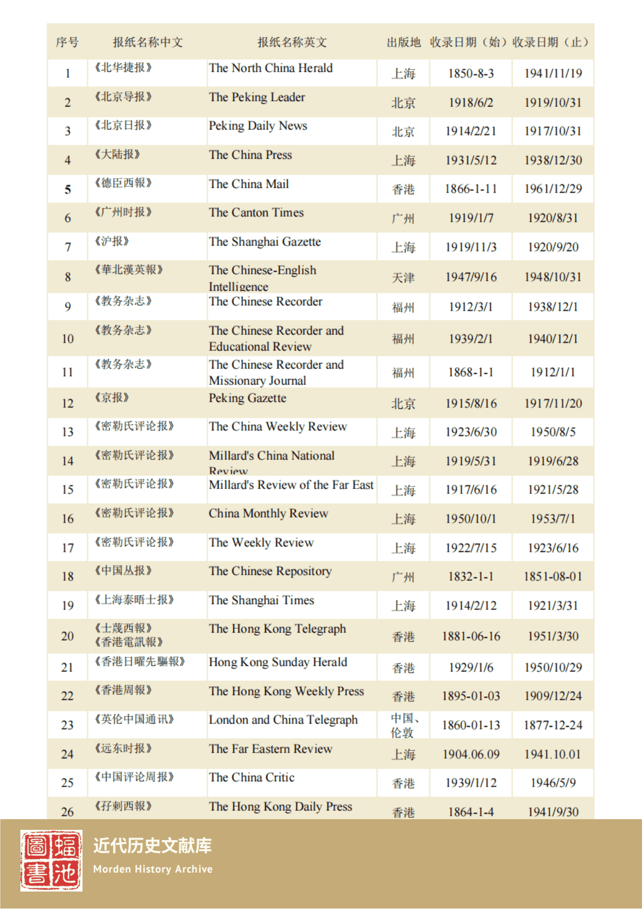 近代历史文献库(中国历史英文报纸)由北京蝠池图书有限公司 全力打造,收录了从1832年到1948年期间在中国发行的历史英文报纸25种,约7.6万余期次,这些报纸是记录近代中国社会发展与变迁的重要文献之一。查找老报纸一直都是文史研究中最基础的部分之一,该数据库对于推动近代史、新闻史、经济史、宗教史、人类学、殖民地研究、民族研究、亚洲研究、中国研究、日本研究、历史学、政治学、社会学等各个学科领域的研究进展都有相当高的资料价值。