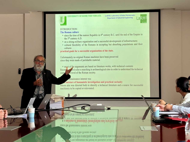 学术报告环节,Marco Ceccarelli教授首先以“Machines and Engineers of Ancient Roma”为题进行了专题报告,介绍了古罗马的机械传统,并通过复原古罗马起重机原型的研究,揭示了罗马工程技术的实用性与创新性。