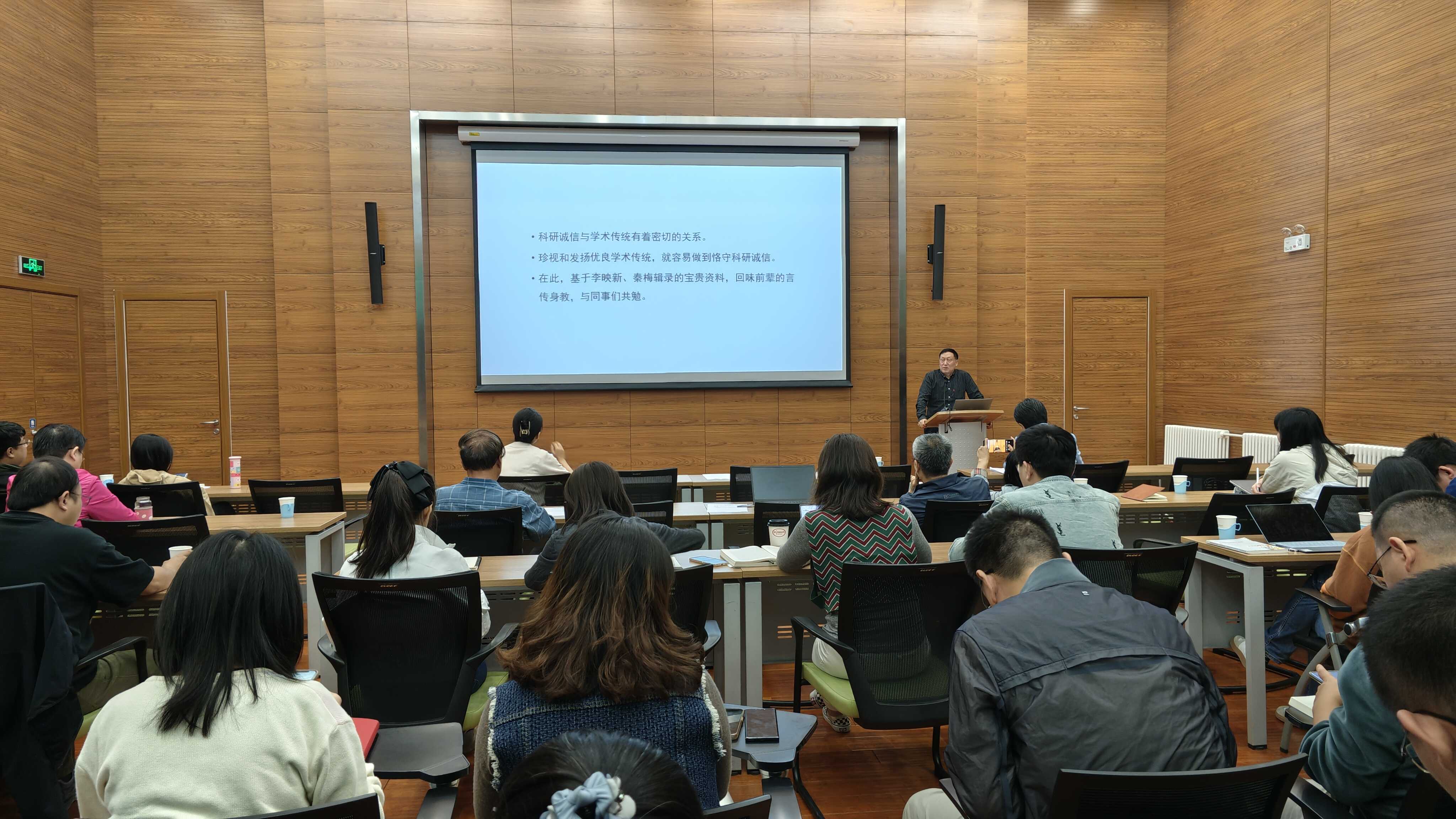 研究所科研道德委员会主任、研究员张柏春作了主题为《发扬优良传统,恪守科研诚信》的报告,从研究所前辈的言传身教切入,结合科技工作者在科研活动中必须坚守的科研诚信要求,鼓励大家珍视和发扬优良学术传统,做到恪守科研诚信。