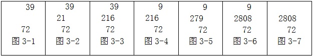 做乘法比如计算72×39时,用算筹分三行摆放数字(仍用印度-阿拉伯数字代替算筹),中间为乘积,上、下为乘数,分别称为上数、下数。先让下数末位与上数首位对齐,如图3-1。用上数首位3乘下数首位7,念“三七二十一”,在中行放21,使其个位1与所乘的7对齐,如图3-2。3再乘下数次位2,念“二三而六”,将6加入中行,如图3-3。上数首位3已乘遍下数各位,故将它撤去,然后右移下数,使末位2与这时的上数首位9对齐,如图3-4。仿照上面的步骤,用上数9依次乘下数各位,加入中行,撤去9,中行得到乘积为2808。如图3-5、3-6、3-7。