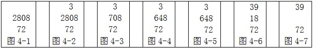 做除法时,被除数、除数分别放在中行、下行,上行先空着等待放置商。先将除数左移,与被除数首位对齐,若相同位上除数比被除数大,则除数向右退一位。如2808÷72,因72>28,故将72与80对齐,如图4-1。试商3,置于上行,与除数个位对齐,如图4-2。以3乘除数首位7,念“三七二十一”,从被除数中与7对齐的位及之前的位所构成的数28中减去21,如图4-3。再以3乘除数个位2,念“二三而六”,从中行减去6,如图4-4。将除数右移一位,如图4-5。商第2位得数9,再按刚才的方法,从中行减去9与除数的乘积,最后除尽得商39,如图4-6、4-7。如果有余数,就得到一个带分数,商为其整数部分,除数、余数分别为其分数部分的分母、分子。