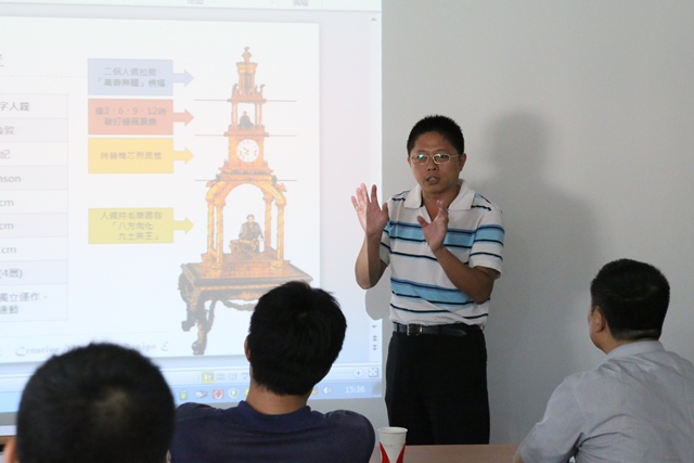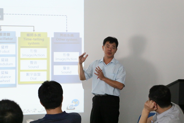 陈羽薰博士作了《明清时期具代表性钟表的复原研究》的主题报告,介绍了由成功大学颜鸿森教授主持的研究团队所开展的明清钟表复原研究项目的目标、内容、进度计划和研究方法,并展示了用颜氏创意机构设计法对“荷花缸钟”和“写字人钟”研究的初步成果。林聪益教授和萧国鸿助理研究员对有关内容做了补充说明。