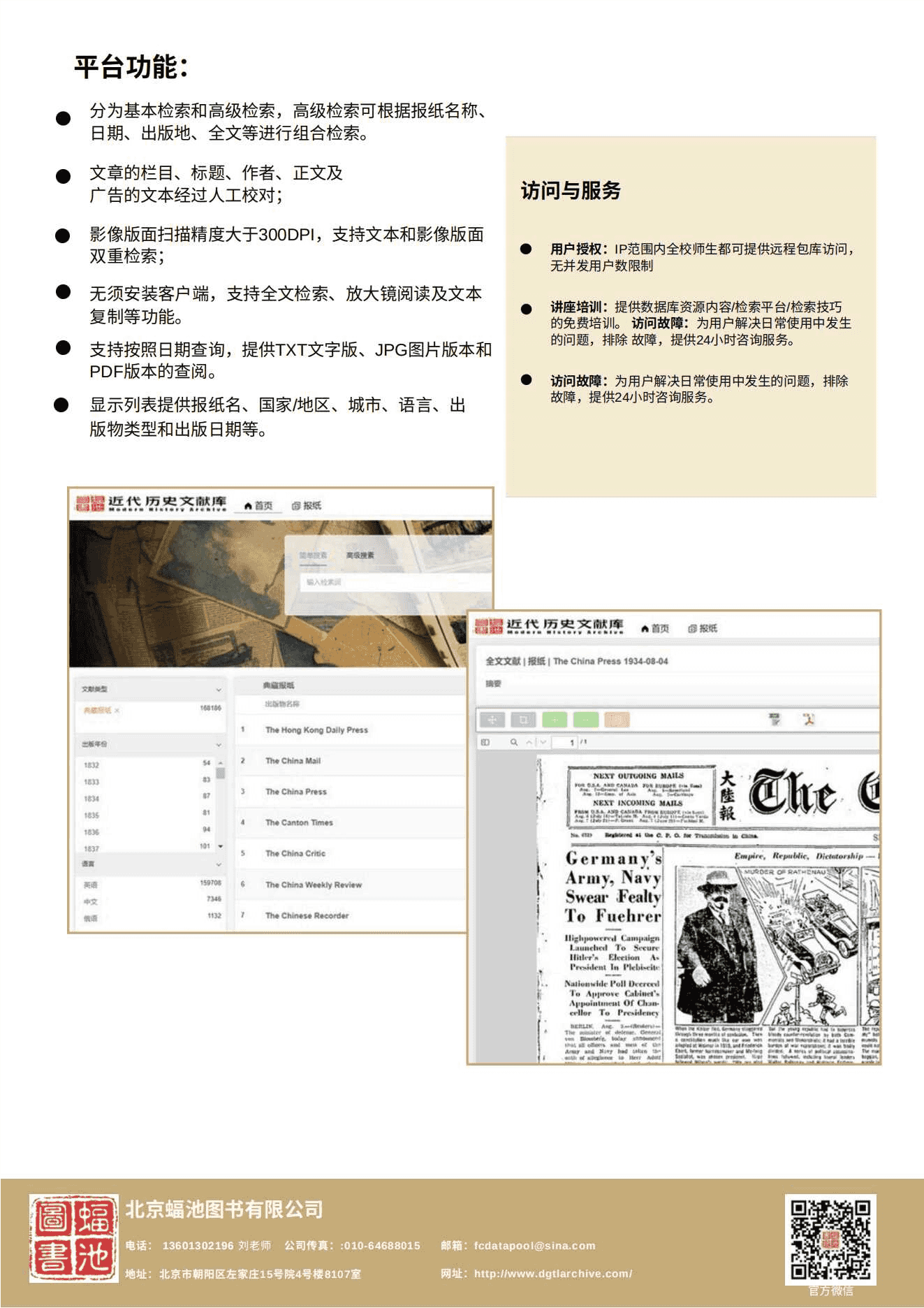 近代历史文献库(中国历史英文报纸)由北京蝠池图书有限公司 全力打造,收录了从1832年到1948年期间在中国发行的历史英文报纸25种,约7.6万余期次,这些报纸是记录近代中国社会发展与变迁的重要文献之一。查找老报纸一直都是文史研究中最基础的部分之一,该数据库对于推动近代史、新闻史、经济史、宗教史、人类学、殖民地研究、民族研究、亚洲研究、中国研究、日本研究、历史学、政治学、社会学等各个学科领域的研究进展都有相当高的资料价值。