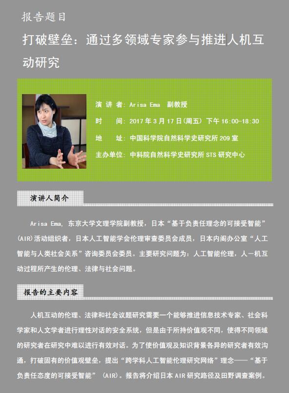 3月17日(星期五)STS中心学术报告:Arisa Ema:打破壁垒:通过多领域专家参与推进人机互动研究