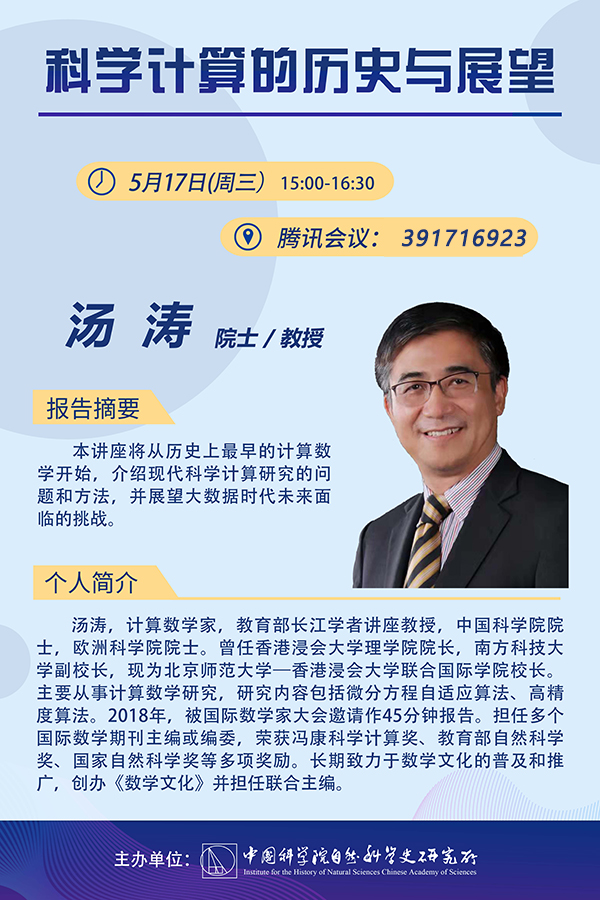 经邀请,北京师范大学-香港浸会大学联合国际学院校长汤涛院士将于5月17日(本周三)下午3点做在线报告,题目为科学计算的历史与展望:腾讯会议No:391716923