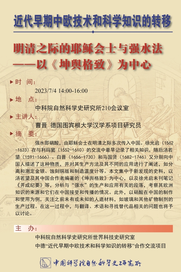 报告主题: 明清之际的耶稣会士与强水法一一以《坤舆格致》为中心