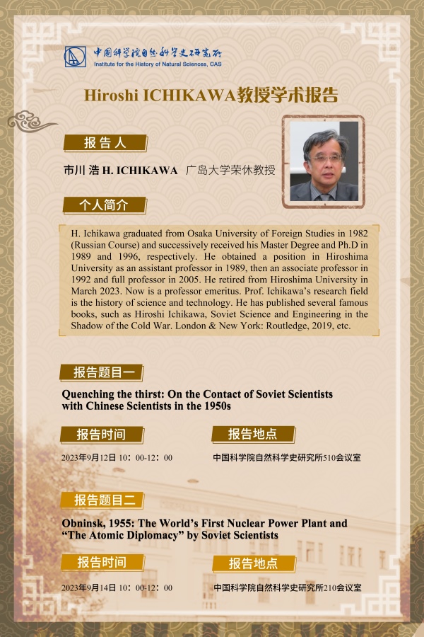 H. Ichikawa graduated from Osaka University of Foreign Studies in 1982 (Russian Course) and successively received his Master Degree and Ph.D in 1989 and 1996, respectively. He obtained a position in Hiroshima University as an assistant professor in 1989, then an associate professor in 1992 and full professor in 2005. He retired from Hiroshima University in March 2023. Now is a professor emeritus. Prof. Ichikawa's research field is the history of science and technology. He has published several famous books, such as Hiroshi Ichikawa, Soviet Science and Engineering in the Shadow of the Cold War. London & New York: Routledge. 2019, etc.