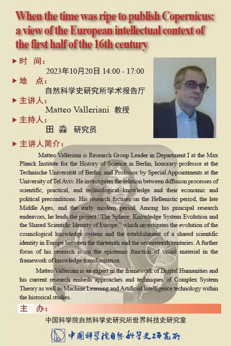 主讲人简介:Matteo Valleriani is Research Group Leader in Department I at the Max Planck Institute for the History of Science in Berlin, honorary professor at the Technische University of Berlin, and Professor by Special Appointments at the University of Tel Aviv. He investigates the relation between diffusion processes of scientific, practical, and technological knowledge and their economic and political preconditions. His research focuses on the Hellenistic period, the late Middle Ages, and the early modern period. Among his principal research endeavors, he leads the project “The Sphere: Knowledge System Evolution and the Shared Scientific Identity of Europe,” which investigates the evolution of the cosmological knowledge system and the establishment of a shared scientific identity in Europe between the thirteenth and the seventeenth centuries. A further focus of his research is on the epistemic function of visual material in the framework of knowledge transformation.