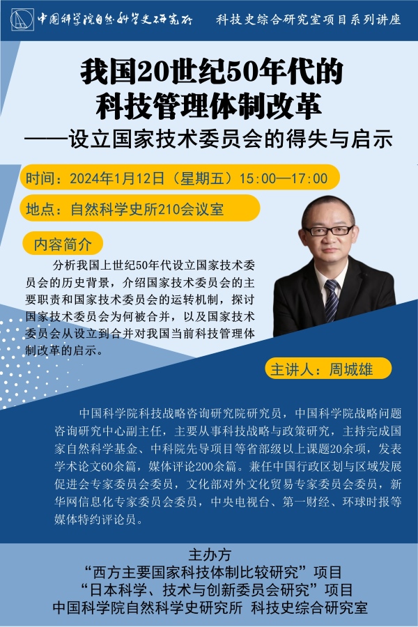 讲座名称:我国20世纪50年代的科技管理体制改革——设立国家技术委员会的得失与启示