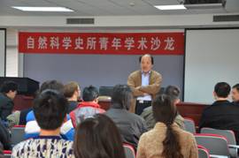 2013年3月15日下午,自然科学史所举办了首期青年学术沙龙。中央研究院院士、台湾新竹清华大学黄一农教授与所内外的青年学者畅谈了科学史研究的经验和人生感悟。副所长王扬宗研究员主持了沙龙,所长张柏春研究员致欢迎词,近50位青年学者和研究生参加了活动。