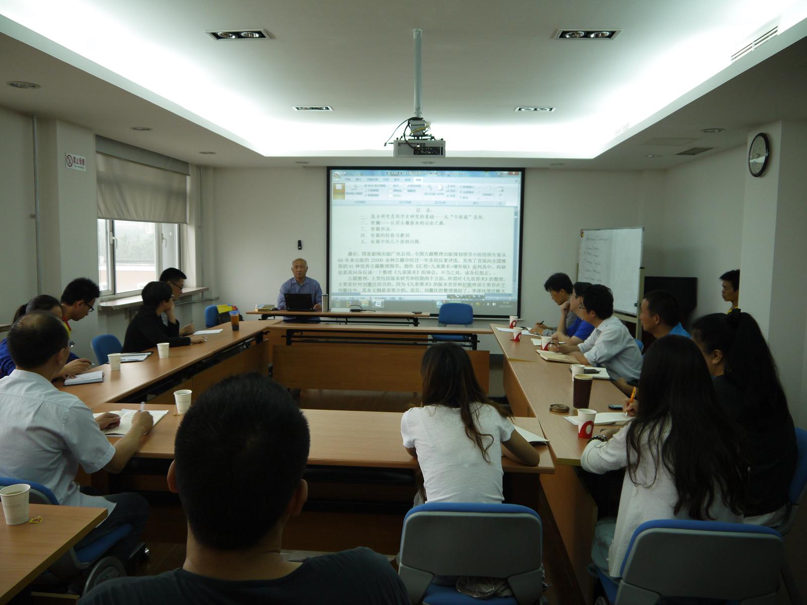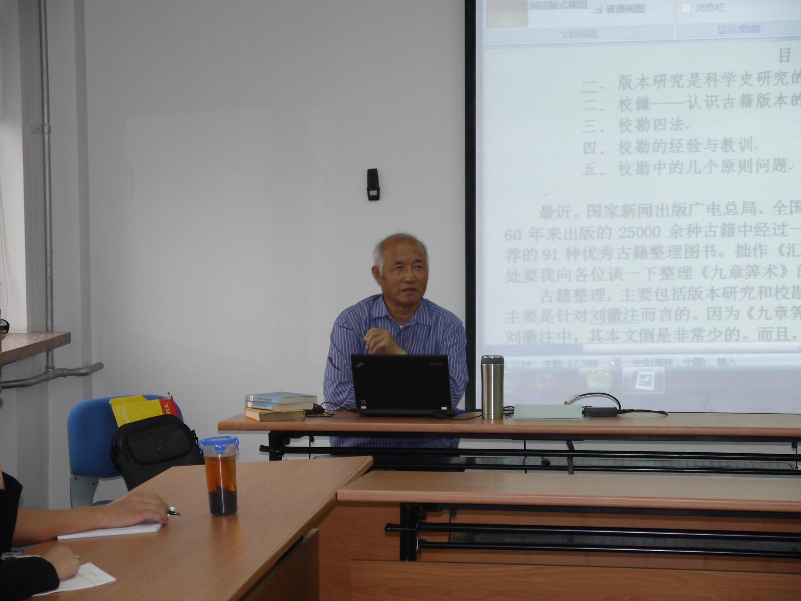 在报告中,郭书春先生首先回顾了自己研究《九章筭术》的原因与遭遇的挫折。然后,指出版本研究是科学史研究的基础,校雠是认识古籍版本的必由之路。他认为通过校雠可以恢复某些非常重要的但是今天已不存在的版本;通过不同版本的校雠,可以判断版本的优劣;通过版本的校雠,可以探究各版本的关系;通过版本的校雠,可以发现我们所研究的版本的真正底本;通过版本的校雠,可以确定校勘工作的底本;通过诸版本的校雠,可以总结出该书衍、脱、舛误的某些规律。接着,他结合《九章筭术》的校勘介绍了陈垣的校勘四法,总结了《九章筭术》等算书校勘中的经验与教训,强调尊重原文是我们科学史工作者首先要树立的态度。最后,他谈了校勘中的几个原则问题。