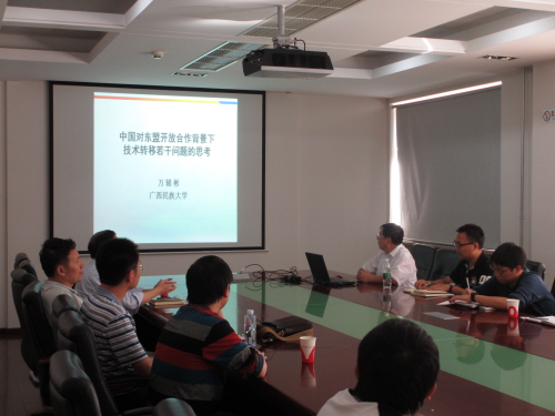 2015年9月25日下午,广西民族大学万辅彬教授在自然科学史研究所作学术报告,题目为“中国对东盟合作背景下科技合作与技术转移若干问题的思考”。刘益东研究员主持了本次讲座。