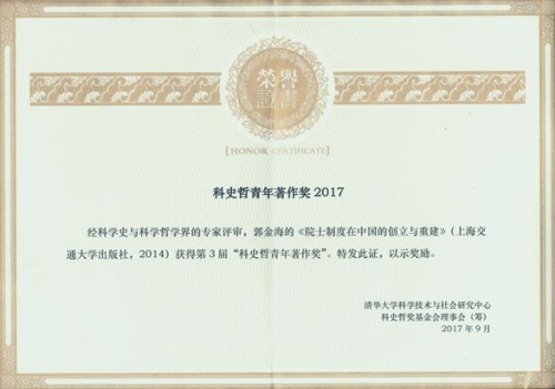 2017年9月16日,第3届“科史哲青年著作奖”颁奖礼在清华大学举行。中国科学院自然科学史研究所研究员郭金海的学术专著《 院士制度在中国的创立与重建》(上海交通大学出版社,2014)获奖。在颁奖礼上,郭金海作了题为《中央研究院第一届院士的选举》的学术报告。