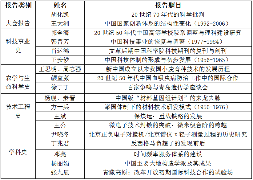 研讨会报告分为“大会报告”、“科技事业史”、“农学与生命科学史”、“技术工程史”和“学科史”五部分,四个时段。分别由胡化凯、郭金海、王大洲和方一兵等老师主持。具体报告题目如下: