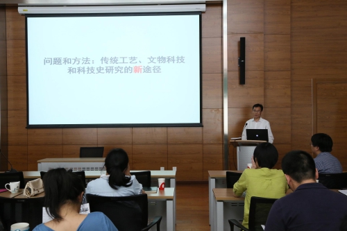 关晓武研究员首先作报告“问题和方法:传统工艺、文物科技和科技史研究的新途径”,指出利用科技手段可突破传统文献考证分析研究方法的局限,并以曾侯乙编钟复制研究工作为例陈述了所内前辈学者利用现代科技手段取得的研究成果,还介绍了应用工业CT技术扫描青铜器,以及通过整合各类技术来获得研究对象完整信息的方法。关老师认为方法的突破和新技术的采用构成了科技史研究的新途径,正在建设中的综合实验室可为研究所多项重大突破任务和重点培育方向课题提供重要技术支撑。他呼吁大家多来使用实验室的仪器设备资源,在研究上取得更好成绩。