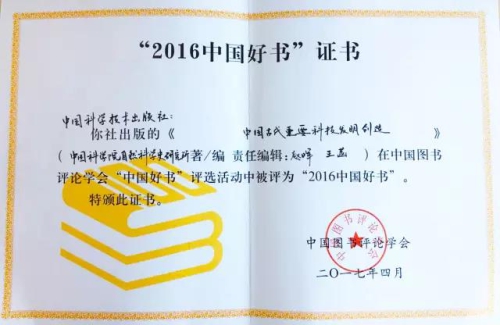 4月23日为“世界读书日”,“2016中国好书”盛典活动登陆央视科教频道。由中宣部指导,中国图书评论学会、中央电视台科技频道举办的2016年“中国好书”榜单揭晓。由自然科学史研究所策划编著的《中国古代重要科技发明创造》喜获科普生活类好书奖。