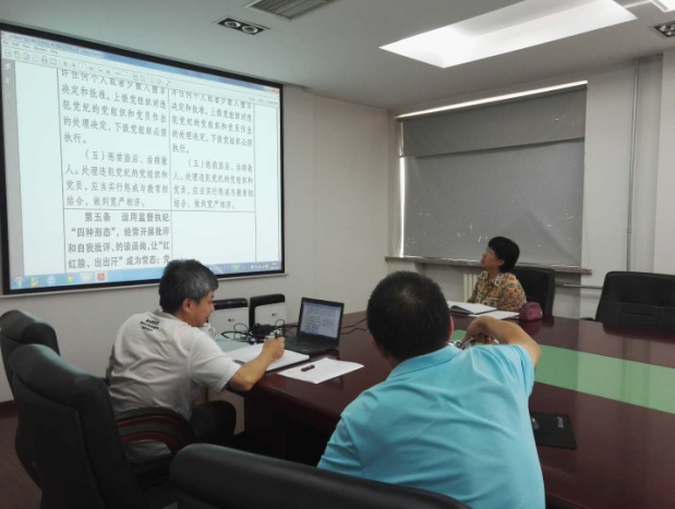 2018年9月20日,所纪委组织纪委委员集体学习新修订的《条例》,党委副书记兼纪委书记赵力主持会议。会上,赵力带着纪委委员们学习了《条例》的总则部分,纪委委员姚立澄带大家学习了分则的第六章、第七章、第八章;纪委副书记李映新带大家学习了分则的第九章、第十章、第十一章和附则部分。赵力对纪委委员和纪检干部提出学习要求,她指出纪检监察干部是《条例》的践行者和执行者,要以打铁必须自身硬的政治要求,学深悟透,为监督执纪问责奠定理论和政策基础。同时,在工作中认真履行党章赋予的职责,强化监督执纪问责,严格执行《条例》,综合运用监督执纪“四种形态”。