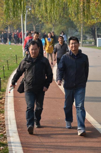 临时决定的运动得到大家的积极响应,近70人踊跃参加。在海淀公园的健步道上,大家甩开双臂,大步前行。映入眼帘的树木色彩绚烂,银杏的黄,松树的绿,水杉的橘,枫树的红……远不同于夏日的翠绿,秋日的景色更是迷人欲醉。大家边走边欣赏美景,不时还和并肩前行的同事热烈讨论。特别是新进所的青年职工,借这个机会相互认识。近3km走下来,大家还是意犹未尽。