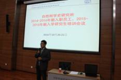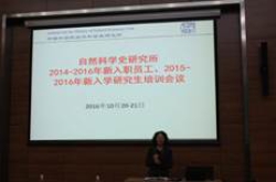 自然科学史研究所“2014-2016年新入职员工、2015-2016年新入学研究生培训”于10月20-21日在学术报告厅举行。所长张柏春、党委书记袁萍、所长助理关晓武、所长助理孙显斌、郭书春研究员、罗桂环研究员、郭金海研究员等出席会议,参加会议的还有管理支撑部门负责人、业务主管及27位新入职员工和新入所研究生(以下简称学员)。会议由袁萍主持。
