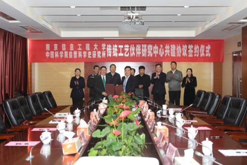 2017年10月27日下午,中国科学院自然科学史研究所与南京信息工程大学共建传统工艺伙伴研究中心的协议签字仪式在南信大举行。科学史所张柏春所长和韩琦副所长,南信大李北群校长和周伟灿副校长等双方领导和专家学者共计15人出席签约仪式。李北群和张柏春先后致词,周伟灿主持。