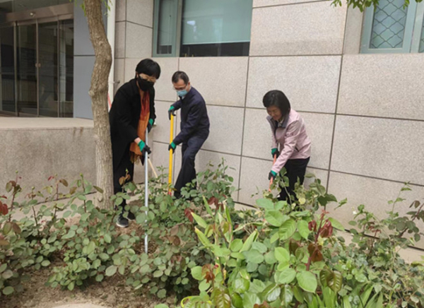 活动现场一派热闹忙碌的劳动景象:有人挥锹铲土,有人培实新土,有人提水浇灌,大家合力打造更美丽的绿地。