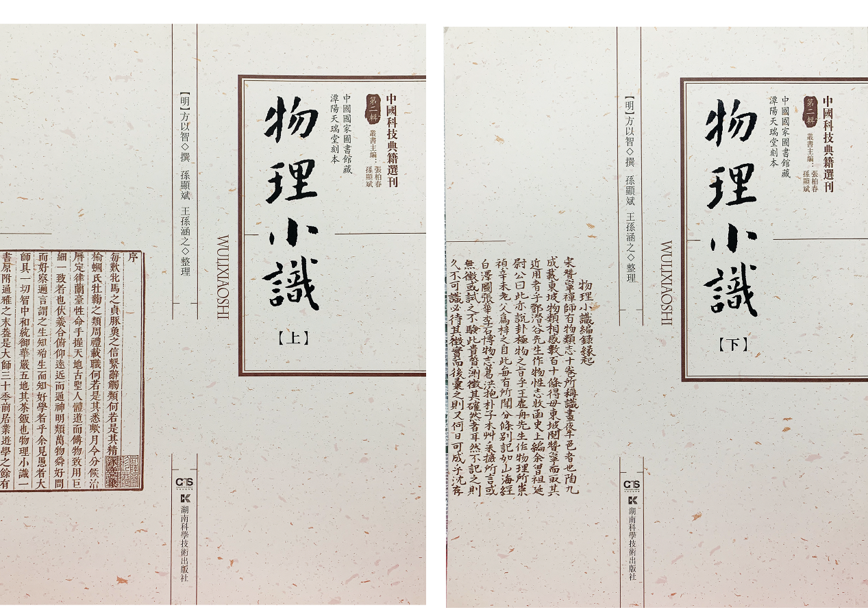 方以智《物理小识》,由自然科学史研究所图书馆馆长孙显斌研究员整理,为《中国科技典籍选刊》第四辑之一种,2019年12月由湖南科学技术出版社出版。