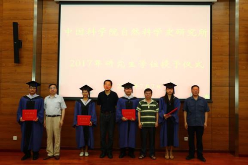 中国科学院自然科学史研究所2017届研究生毕业典礼于7月7日在自然科学史研究所报告厅举行,所长张柏春、党委书记袁萍、副所长韩琦、党委副书记赵力出席,方在庆、关晓武、郭金海、韩毅、刘益东、孙承晟、邹大海等导师代表与在读研究生、毕业生及家属一起参加了典礼。
