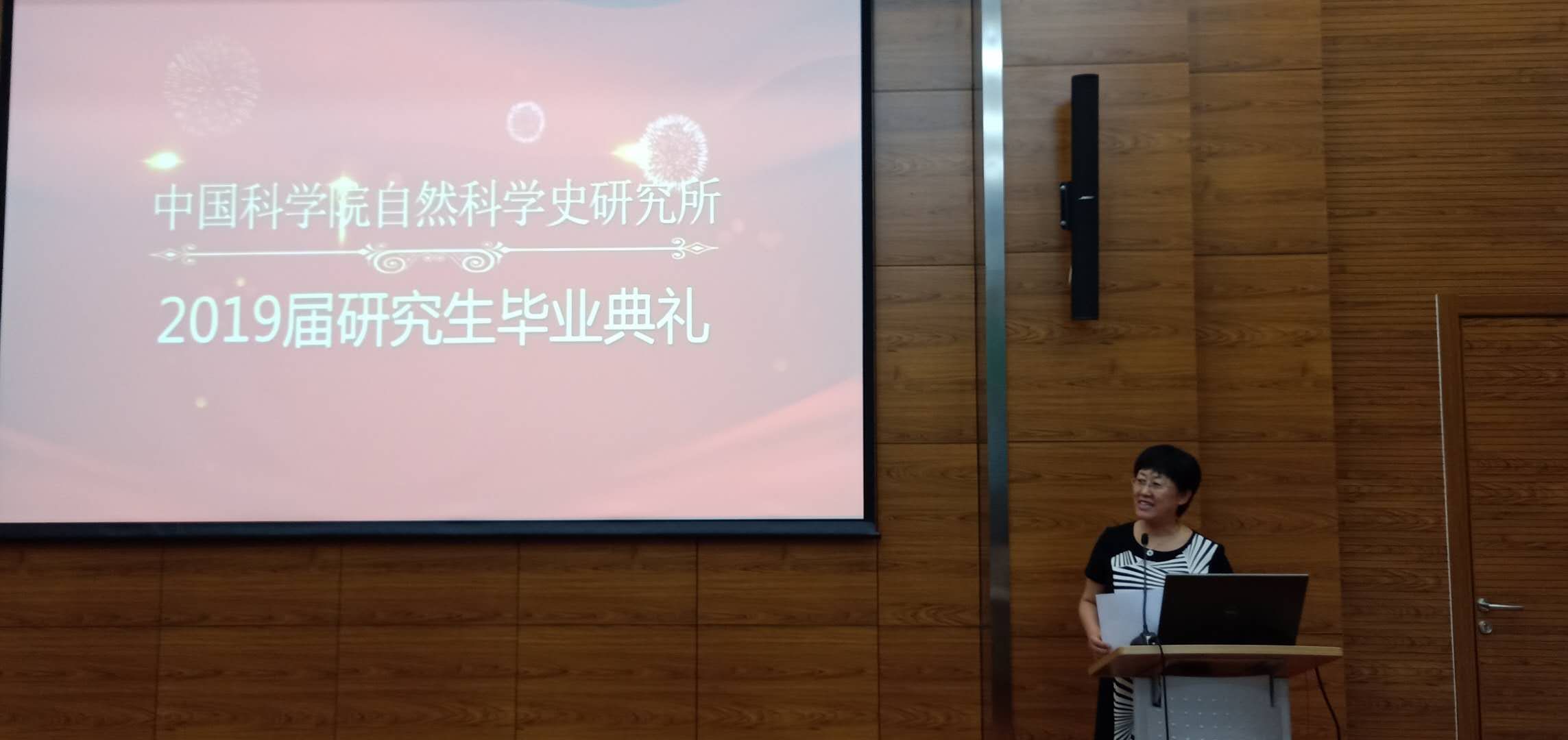 方一兵研究员作为导师代表讲话。她指出研究所具有一种独特的气质,是能够让人静下心来看书、安安静静做学问的气质。她希望在读的同学们能够把握和继承这种气质,希望继续从事科技史研究的毕业生们能青出于蓝而胜于蓝。