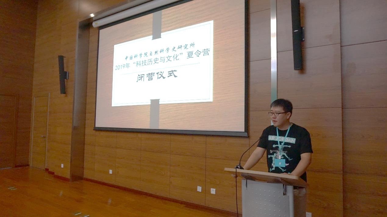 所长助理关晓武研究员发表闭营致辞,他首先对本次夏令营的成功举办表示祝贺,并对参与此次夏令营的老师、志愿者及营员们表示感谢,称赞了营员们在活动中展现出的积极向上、吃苦耐劳的品质。他认为此次夏令营为营员们提供了一个接触研究所和展示自我的优秀平台,希望同学们能从中获得成长,明确目标,在未来的学习道路上严守学术道德。他鼓励营员们不忘初心,脚踏实地,为学科领域添砖加瓦,为国家学术建设贡献力量,也欢迎营员们在夏令营之后与研究所继续保持互动。最后,关晓武研究员宣布,2019年中国科学院自然科学史研究所第二届大学生“科学历史与文化”夏令营正式闭营。