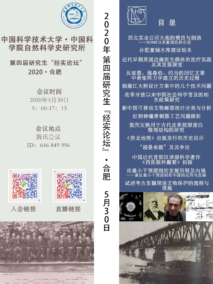 2020年5月30日,由中国科学技术大学科技史与科技考古系和中国科学院自然科学史研究所联合举办的第四届研究生“经实论坛”线上成功举办。中国科学技术大学石云里教授、钮卫星教授、关瑜祯教授、龚钰轩特任副研究员、王安轶特任副研究员、任安波特任副研究员、张兴香特任副研究员、柯资能副教授、付邦红副教授、褚龙飞副教授、丁兆君副教授和科技考古实验室李功老师,以及自然科学史研究所副所长关晓武研究员、陈晓珊研究员、刘金岩副研究员、黄兴副研究员、焦郑珊助理研究员、李明洋助理研究员和李润虎助理研究员等出席论坛,并担任点评人。借线上论坛契机,来自中科大、科学史所两家单位及其他高校的百余名老师同学参加了此次会议。
