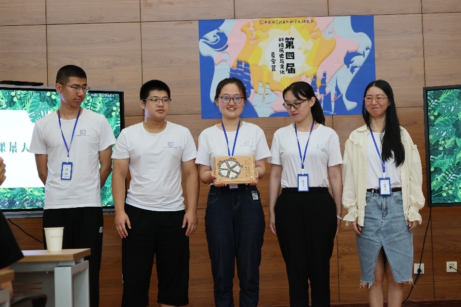 综合现场评委老师和网络平台的投票,付韵蕾公布夏令营成果展示的排名,科学革命组获得第一名,王维佐为小组成员颁奖。