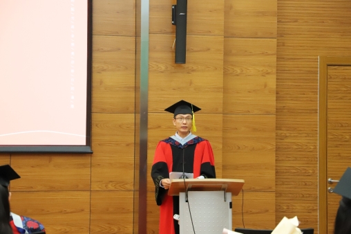 在学位授予仪式上,邹大海宣读了学位授予名单。关晓武、邹大海、韩毅、郭金海依次为毕业生拨穗,颁发学位证书。现场还播放了老师代表对毕业生的寄语。