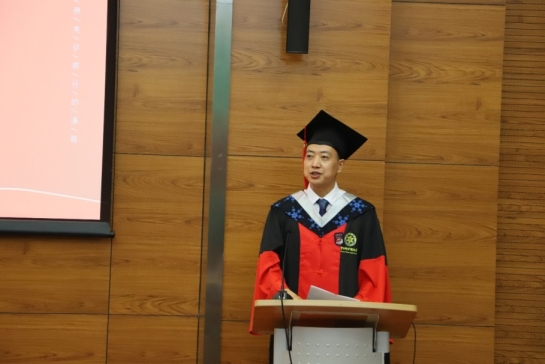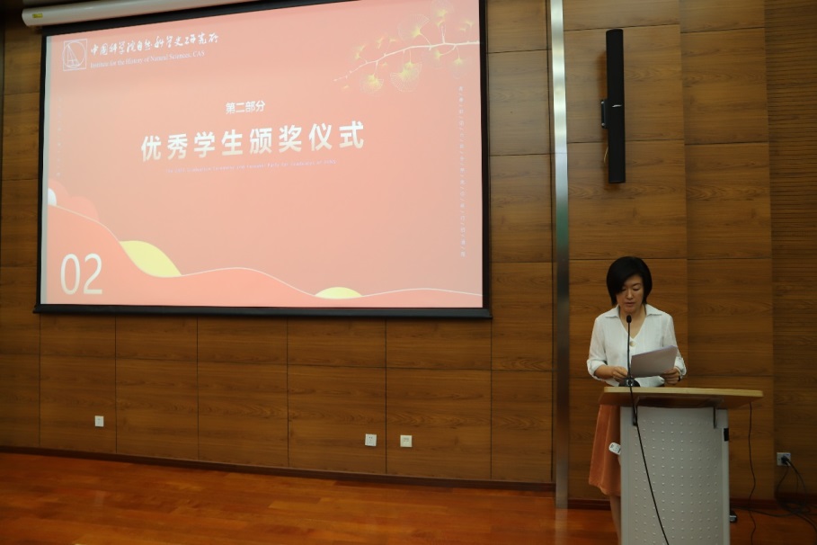 毕业生代表、2019级博士李盼飞以“逝者如斯夫”作为开头,发表自己的毕业感言。他总结自己三年来与同学们共同学习生活的点点滴滴,有对所楼下玉兰树的怀念,有对疫情下独特的封闭校园生活的感悟。最重要的是,在研究所接受了科技史专业训练,使他立志于在未来努力成为一个职业的科技史学者。他最后衷心感谢导师和所内师生对自己的帮助,并为学弟学妹留下真诚的建议和祝愿。