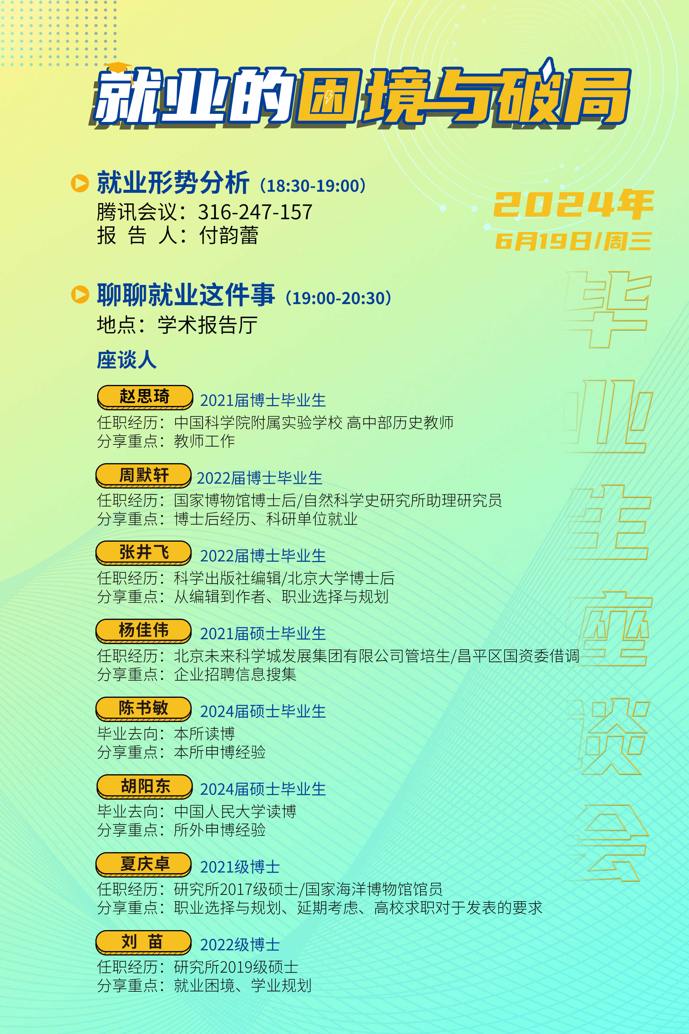 面对日益严峻的就业形势,自然科学史研究所研究生部于2024年6月19日晚在学术报告厅举办了以“就业的困境与破局”为主题的毕业生座谈会。此活动邀请了往届生代表与全体毕业生参与,同时吸引了许多在读学生和导师,共同探讨当下的就业挑战与机遇。