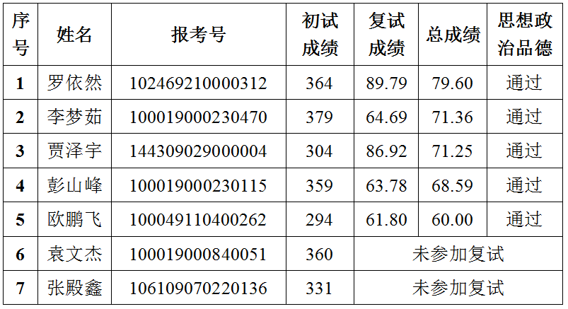 中国科学院自然科学史研究所2019年硕士研究生招生复试小组根据国科大的通知要求,在研究所招生领导小组的领导下,于3月26-27日对5名调剂考生进行了复试,全程录音录像,督查组对复试过程进行了监督。 现将复试结果通告如下: